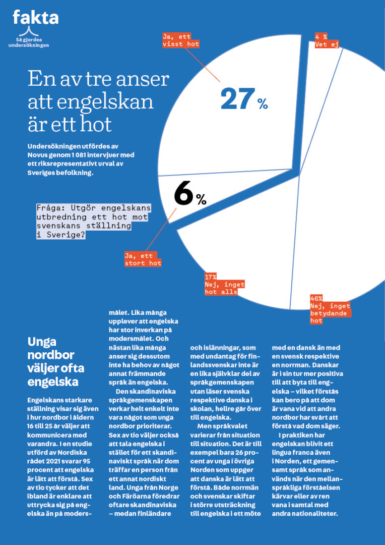 Ända sedan andra världskrigets slut har engelskan målats upp som ett hot mot svenskan. Men sex av tio anser inte att engelskan hotar svenskans ställning. Det visar en undersökning utförd av Novus på uppdrag av Språktidningen.