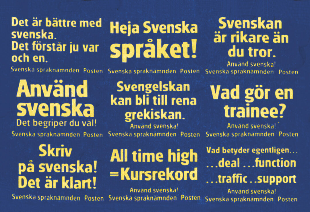 Svenska språknämnden – arvtagare till Nämnden för svensk språkvård och föregångare till dagens Språkrådet – gjorde 1987 gemensam sak med Postverket i en kampanj mot ”svengelska”. Klistermärken i svenska flaggans färger – gul text på blå botten – med budskap riktade mot engelskans inflytande skickades med ett nummer av Språkvård, nämndens tidskrift: