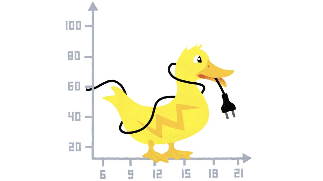graf som visar ett visst förhållande mellan tillgången till elektricitet från solenergi och efterfrågan på elektricitet, där de två linjerna bildar en figur som påminner om en tecknad anka