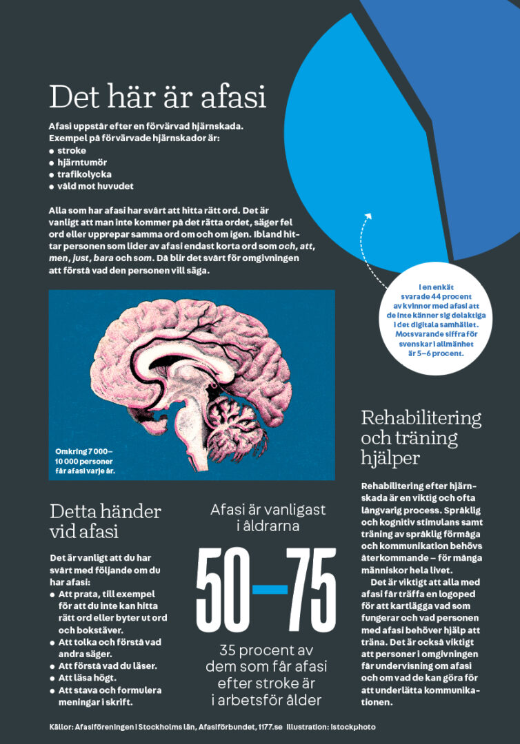 – Jag blir väldigt trött, hjärntrött. Att prata med dig nu är jobbigt för mig. Och läsa kan jag bara göra en kort stund. Sedan måste jag vila. När jag umgås med andra som har afasi är det mer avslappnat, men även då blir jag väldigt trött efteråt.