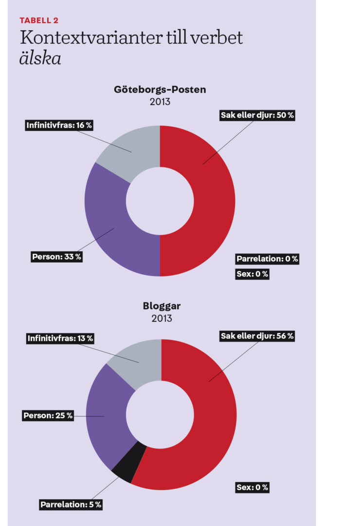 För att undersöka främst objekten, det vill säga vad man älskar, har jag gjort omfattande stickprov på både informella bloggtexter och något formellare tidningstext i Språkbankens material. Det är den senaste av de tillgängliga databaserna (så kallade korpusar) med dagstidningstext. Hela materialet är nio år gammalt och omfattar cirka sexton miljoner löpord. I tabell 2 här nedan redovisas resultatet i procent.