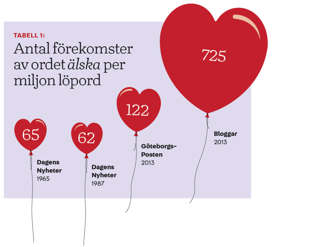 Under de senaste sextio åren har vi haft tillgång till stora sökbara datamängder, bland annat i Språkbanken vid Göteborgs universitet. Framför allt handlar det om hela årgångar av dagstidningstext på minst en miljon löpord (ord i löpande text) – ofta upp till tjugo miljoner. Vi kan därför följa frekvensen för enskilda ord, och se att ordet älska, inklusive böjningsformer, har blivit dubbelt så vanligt från 1987 till 2013. (Hur ofta vi har uttalat ordet är svårare att veta.) Ordet kärlek, å sin sida, har faktiskt minskat något.