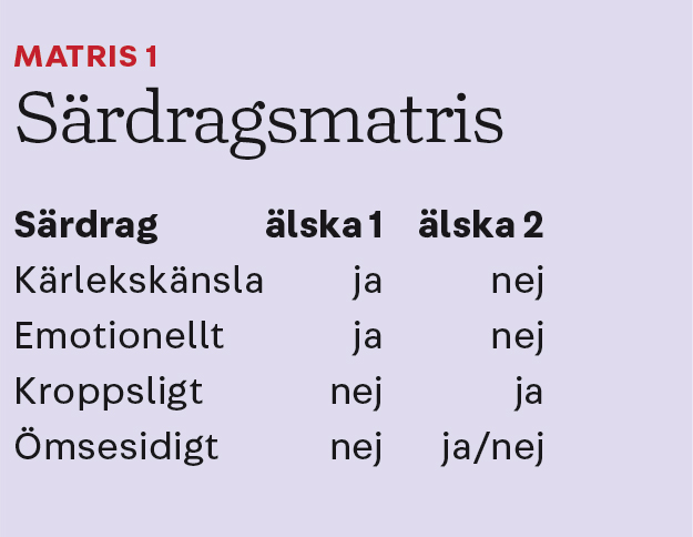 Kärlek är aldrig lätt. Men ordet kärlek är än mer besvärligt. Vi saknar verbet kärleka (motsvarande hata) och får hanka oss fram med älska som i sin tur saknar substantivet älsk (motsvarande hat). Dessutom har vi det nerkortade adjektivet kär trots att vi oftast gör adjektiven längre med en ändelse (motsvarande hatisk). Men dessa småsaker är ingenting mot de semantiska, betydelsemässiga, problemen: vad betyder ordet kärlek egentligen?