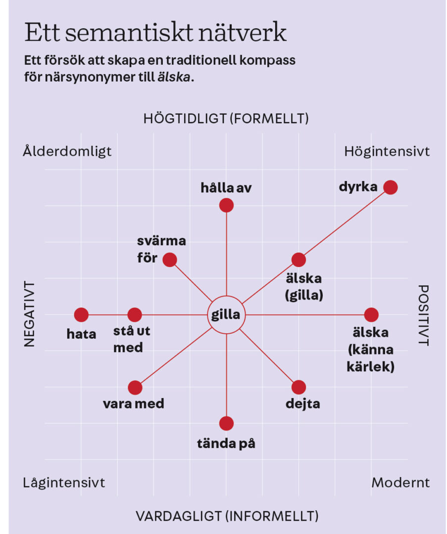 Här föreslås gilla som centralt och neutralt ord, alltså ”defaultordet”. Traditionellt ligger älska östligt, men ordet får inte någon markerad plats på axlarna för modernitet och formalitet. Utvecklingen tycks gå i riktning mot att älska slår ut gilla som defaultord. Enligt den senaste statistiken är gilla vanligare än älska i tidningstexter, men tvärtom i bloggtexter. Så vi får se.