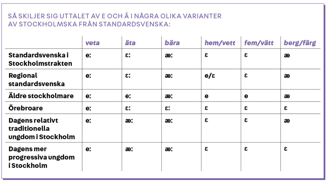 På senare år har det nämligen börjat hända saker i Stockholm. Vi hade precis hunnit vänja oss vid att ungdomen säger ”Vart är vi på v[æː]g?” och kanske tänkt att nu får väl språkhistorien ändå ta sig en liten paus, men då fick en ny kull ungdomar för sig att börja tala delvis som i Örebro! Jag har själv noterat detta under några år när ett par tonåringar från södra Stockholm i linje med sin ålder säger [æːta], men som i motsats därtill faktiskt uttalar värre som [vɛrːɛ], det vill säga med samma vokal som i hette och längd. Ett tag trodde jag att detta kanske kunde vara något väldigt lokalt, men under vintern har jag hört kombinationen [æːta] och [vɛrːɛ] även i barn-tv, och nyligen diskuterades frågan i ett inslag i P4 Stockholm, så av allt att döma börjar detta ta fart. Vi bor alltså, enligt dessa yngre medborgare i Sv[ɛ]rige, inte Sv[æ]rige.