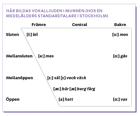 Vokalerna kan dessutom vara korta eller långa. Längd markeras i fonetisk skrift med tecknet ː efter det ljud som är långt, som i till exempel väsa [vɛːsa] och vässa [vɛsːa].