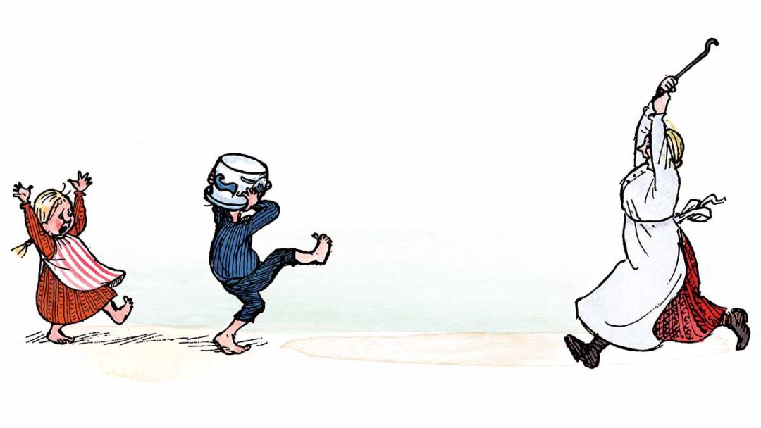 Lika givet är det att det i boken talas om opp och oppe till skillnad från standardsvenskans upp och uppe. Samma vokalmönster – där u blir o – hittar vi i den klassiska repliken ”Förgrömmade onge, ska du läre din syster å sväre?” i filmen Emil och griseknoen från 1973.