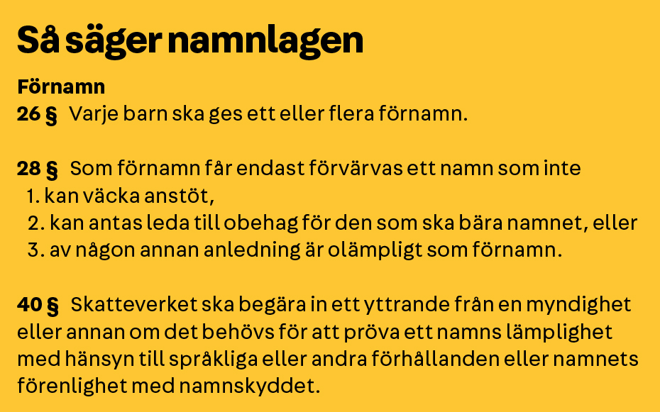 – Med tanke på läget i världen i dag skulle det nog, i bebisfallet, bli föremål för diskussion både på Skatteverkets rättsavdelning och hos Institutet för språk och folkminnen, tror Ingegerd Widell.