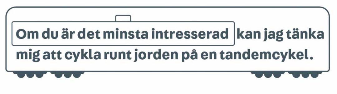 Bisatser då, undrar kanske någon. Är de ligister som olovligen beträder spåret? Eller såna där dressiner som cyklas runt av människor i blåställ? Nej, det är de inte, och här kommer en av de allra viktigaste sakerna vi behöver vara överens om för att detta land ska gå åt rätt håll (åtminstone om du frågar en engagerad svensklärare med intresse för svensk meningsbyggnad): En bisats ligger, enligt grundreglerna för svensk syntax, inuti en huvudsats. I tågmodellen har jag låtit dem representeras av bagage. Titta här, hur huvudsatsen ”om du är det minsta intresserad kan jag tänka mig att cykla runt jorden på en tandemcykel” blir på vår tågbana!