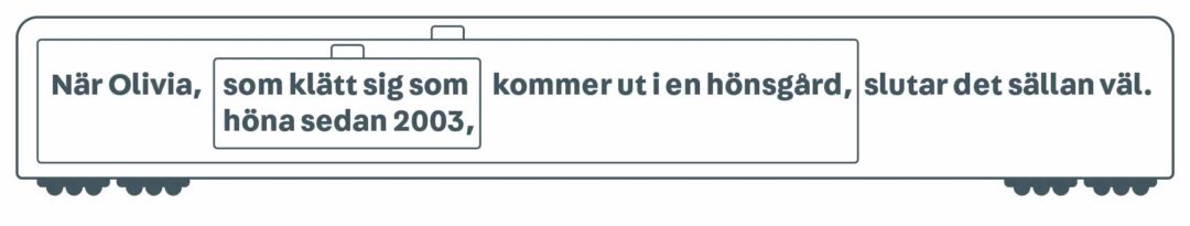 Likt väskor kan bisatsen ligga lite var som helst i tågvagnen (fast bara på anvisade platser) – och en väska kan innehålla en annan väska. Som i huvudsatsen ”när Olivia, som klätt sig som höna sedan 2003, kommer ut i en hönsgård, slutar det sällan väl”.