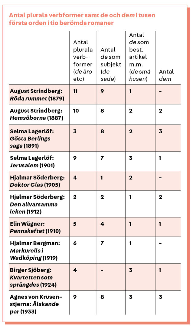 Jag tog tio romaner som har klassikerstatus och läses än i dag. I dom räknade jag hur många gånger det förekommer en plural verbform på dom första tusen orden. Jag räknade också hur många gånger det står de eller dem. Resultaten framgår av tabellen här intill. Jag har skiljt på de som subjekt, de gick hem, och som bestämd artikel, de närmaste vännerna, eftersom en del finner dom mer störande i den senare konstruktionen.